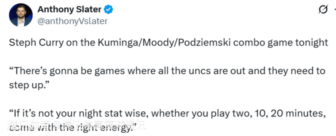 随后又有记者提问:“今晚穆迪、波杰姆斯基打得很出色,还有另外几位球员也是如此。考虑到球队里球员年龄有差距,你们是如何在整个赛季里保持竞争力、一直赢球的呢?”库里表示:“总会有比赛是‘叔叔辈’球员(核心老将)缺席的情况,这时候他们就需要站出来。如果某场比赛你的数据表现不佳,无论你打了2分钟、10分钟还是20分钟,都要带着正确的能量上场。”