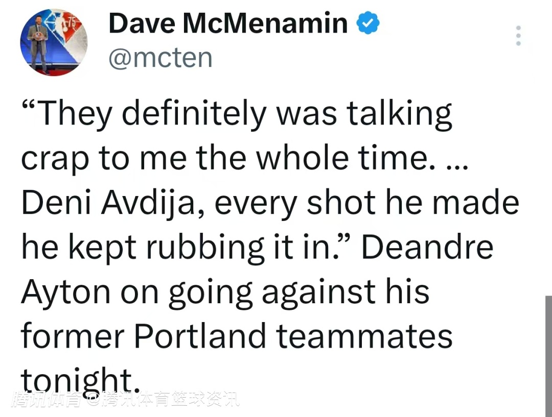艾顿谈及对阵开拓者队的比赛时表示:“他们全程都在对我喷垃圾话。阿夫迪亚他每投进一个球,就一个劲地在我面前炫耀。”