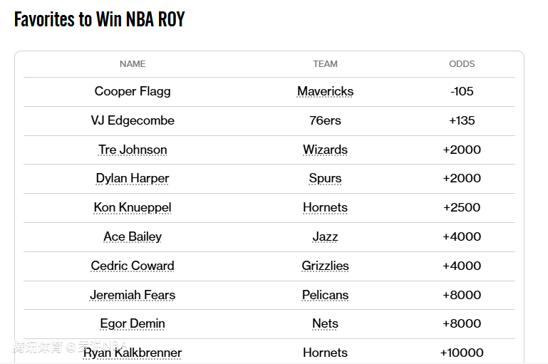 年度最佳新秀奖项的最新赔率前10名如下:1.弗拉格(-105)、2.埃奇库姆(+135)、3.特雷-约翰逊、迪伦-哈珀(同为+2000)、5.克努佩尔(+2500)、6.贝利、考沃德(同为+4000)、8.费尔斯、德明(同为+8000)、10.卡尔克布伦纳(+10000)。