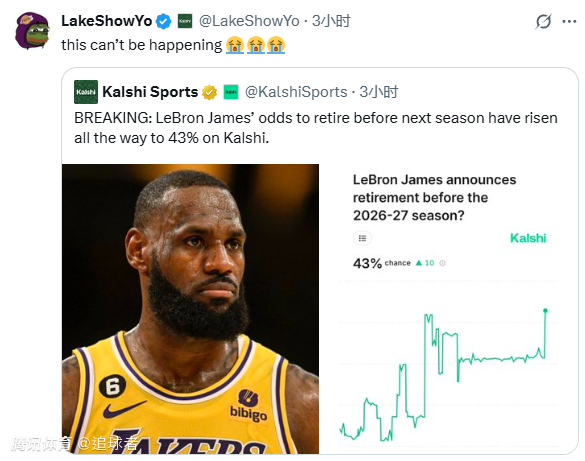 目前詹姆斯正在养伤,大概还需要再休养三周,预计11月中旬才能复出,2025-26赛季会是老詹职业生涯最后一年吗?最新的预测概率显示,詹姆斯在2026-27赛季前退役的概率升到43%。