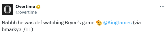 究竟詹姆斯在看什么视频?美媒Overtime转发并且写道:他肯定在看布莱斯的比赛。