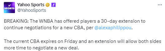 2025-10-29 07:40北京时间10月29日,根据ESPN记者Alexa Philippou报道,WNBA官方已向球员工会提出,将新劳资协议的谈判期限延长30天。