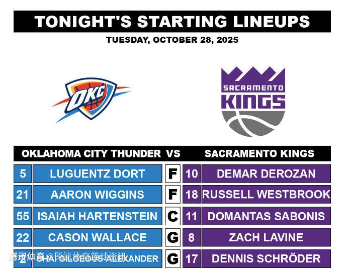 2025-10-29 08:00北京时间10月29日,NBA常规赛继续进行,国王队对阵雷霆队。赛前,双方公布了本场比赛的首发阵容,威斯布鲁克迎来自己在国王生涯的第一次首发。