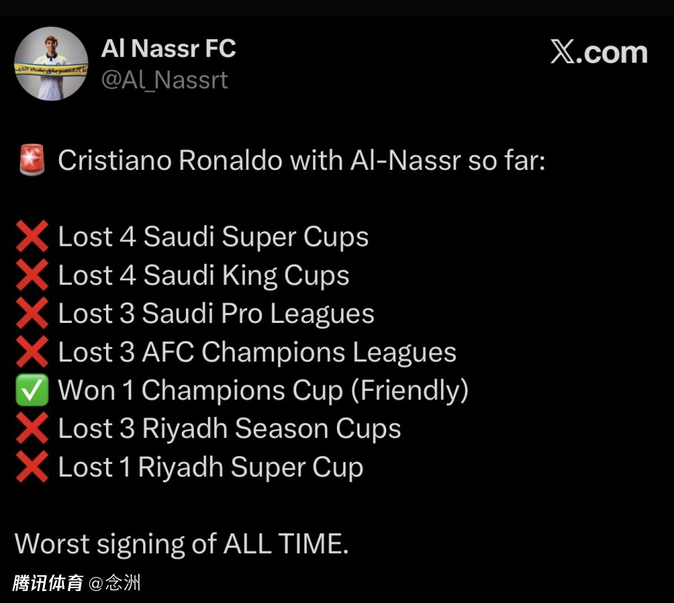 从赛事来说,C罗加盟以来,3次沙特联,4次沙超杯,4次沙王冠,3次亚冠,3次利雅得赛季杯,1次利雅得超级杯,18大赛事0冠!只拿到一个国际足联不承认的阿拉冠的冠军奖杯。