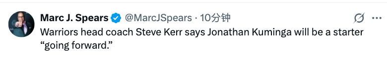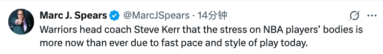2025-10-29 09:40北京时间10月29日,勇士队主教练科尔接受了媒体的采访,采访中他表示,由于当今NBA比赛节奏快、风格激进,球员身体承受的压力比以往任何时候都要大。另外他也表示,库明加接下来将会成为球队的首发球员。