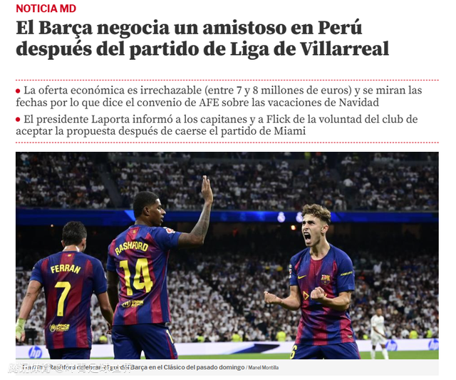 这场表演赛的时间安排,巴萨需要与西足协进行商讨。本年度巴萨的最后一场,是12月20日客场挑战比利亚雷亚尔;2026年巴萨的首战,是1月3日客战西班牙人。巴萨计划在圣诞假期,将800万欧元的出场费赚到手。
