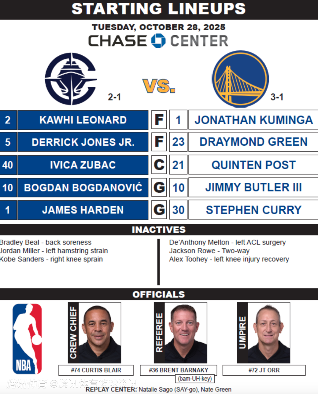 2025-10-29 10:50北京时间10月29日,今天上午11点,勇士将会坐镇主场,背靠背迎战快船。赛前双方的首发阵容正式出炉。