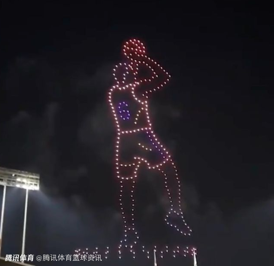 去年8月24日,洛杉矶道奇队使用无人机给湖人已故名宿科比庆生,当时他们用无人机在空中拼出了科比经典的单手指天造型,以此来纪念科比生日和科比日。除了科比,他们致敬了詹姆斯。当科比的画面被撤掉后,无人机就开始组成詹姆斯的图案,选择的动作是投篮。
