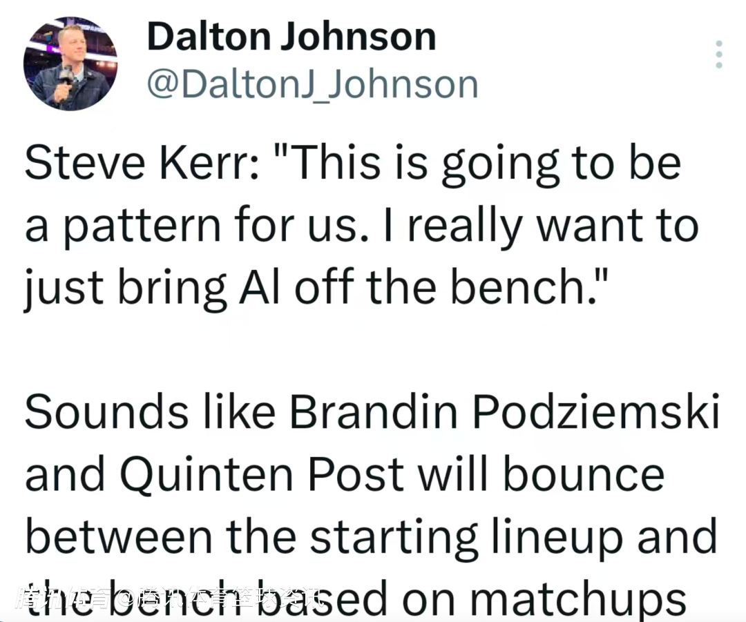 关于本场阵容安排,科尔表示,球队计划在波杰姆斯基和波斯特之间轮换,担任第五位首发球员。他希望在霍福德出场时间有限的情况下,仍让其留在替补席。库里、巴特勒、追梦和库明加则是四名固定首发。