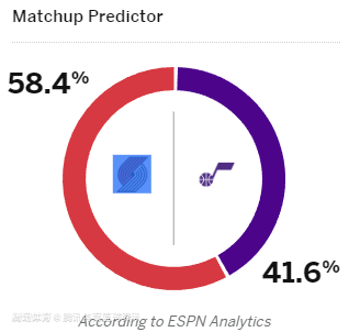 开拓者胜率58.4%,爵士胜率41.6%。