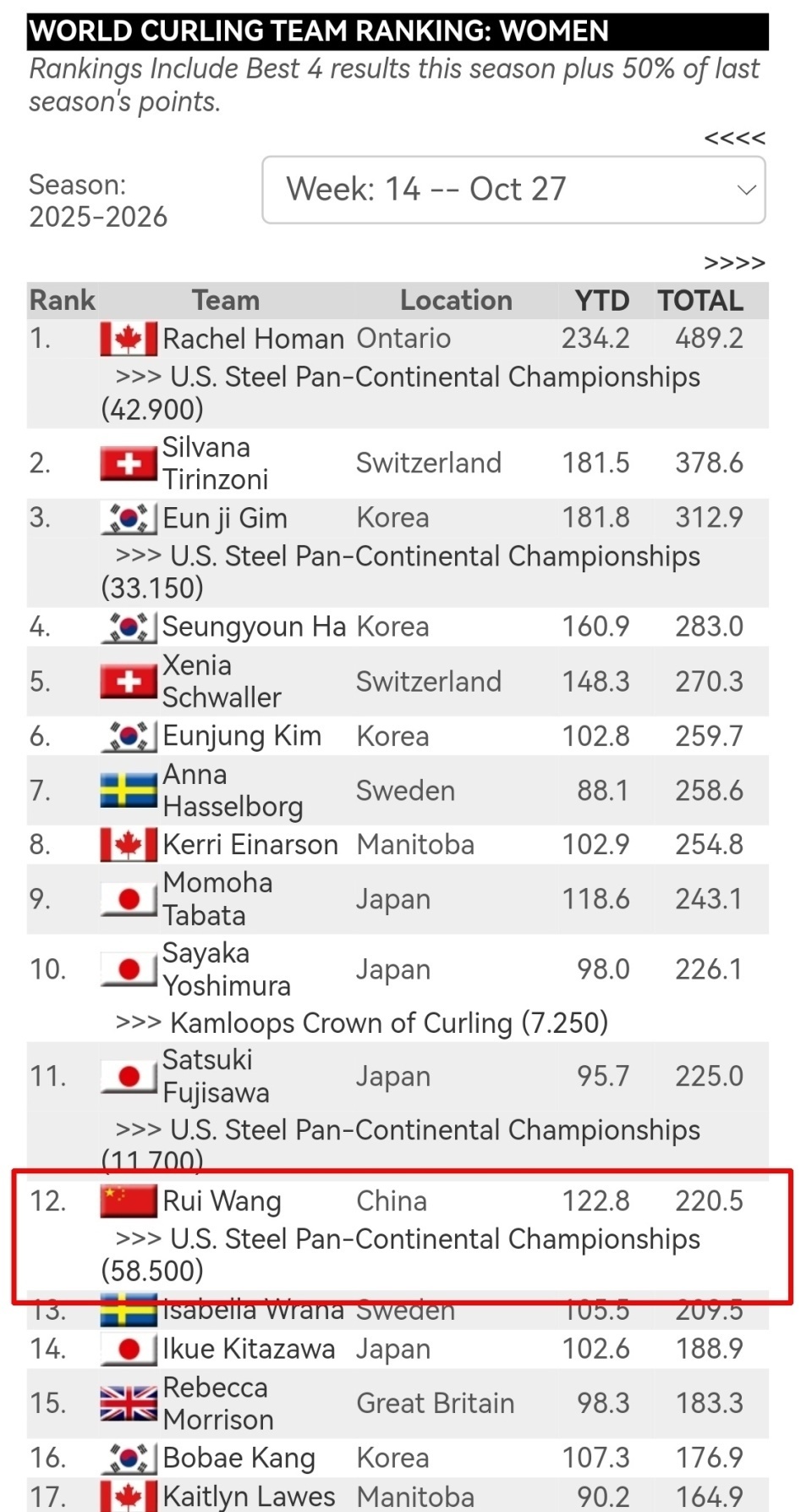 而在泛大陆赛上以9战全胜且双杀世排第一的加拿大-霍曼队后,中国女队收获了58.5个积分,即便减去因为过期而失效的一部分积分,目前也以220.5分排名上升到第12位。