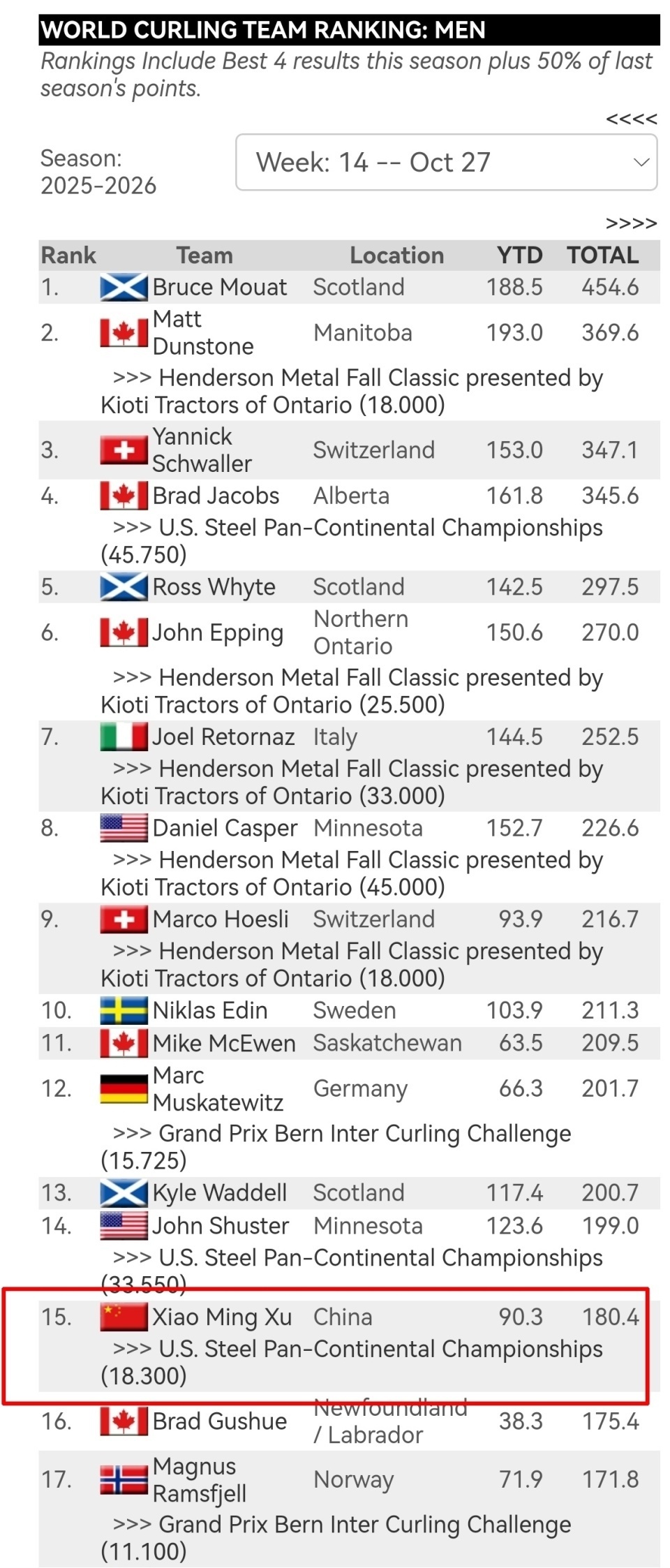 2025-10-29 16:20随着最后一届泛大陆冰壶锦标赛上周在美国弗吉尼亚落幕,获得名次的队伍世界积分排名也在今天一并更新:拿到冠军的中国女队,目前排在第12位;获得第四名的中国男队,也上升到第14位。