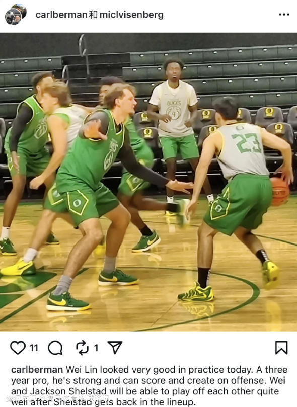 从视频中可以看到,林葳持球后杀入篮下,撞开防守球员将球打进。该记者还配文写道:“林葳在今日的训练中表现十分出色。作为一名拥有三年职业经验的球员,他身体素质强悍,在进攻端既能得分,也具备创造进攻机会的能力。待杰克逊-谢尔斯特德(俄勒冈大学的核心后卫)回归阵容后,林葳与谢尔斯特德两人将能够形成出色的配合,相互为对方创造进攻空间。”
