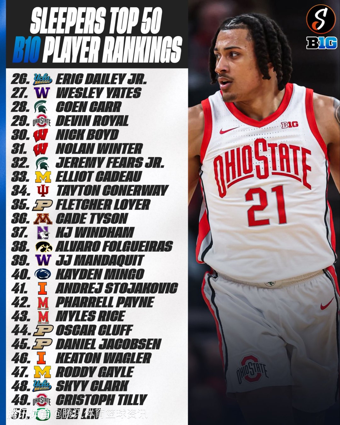 此外,美国媒体Sleepers Media发布了一份BIG10联盟的TOP50球员,俄勒冈大学三人上榜,林葳排在第50名。