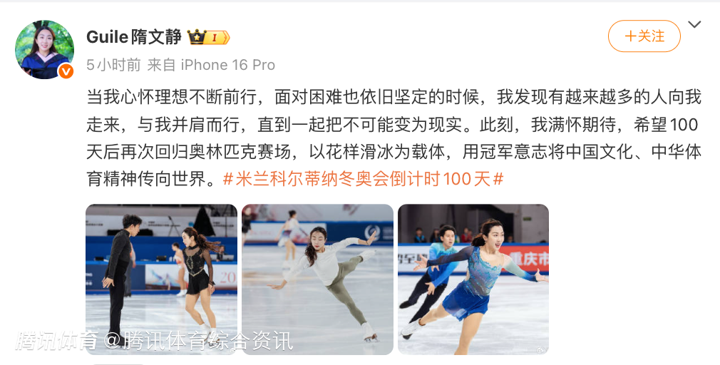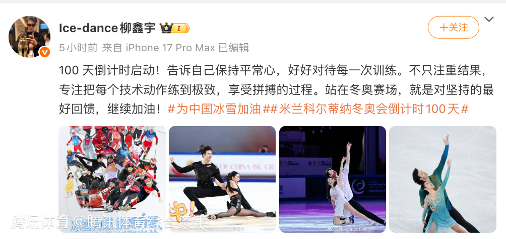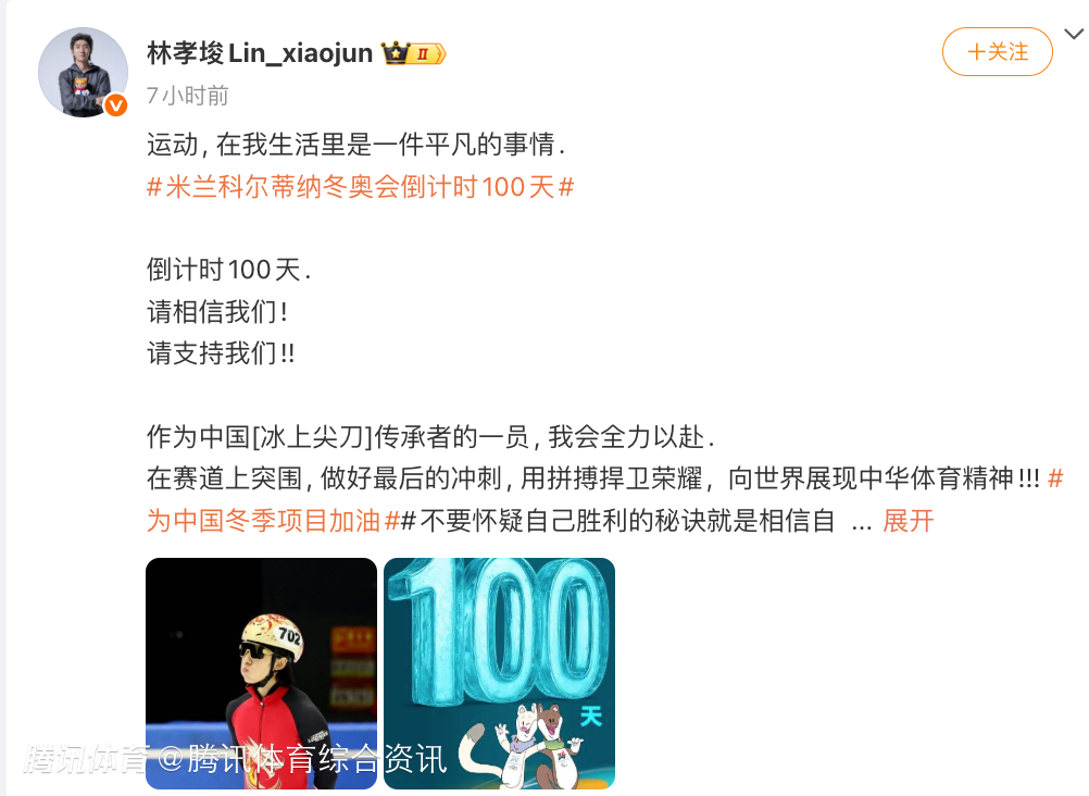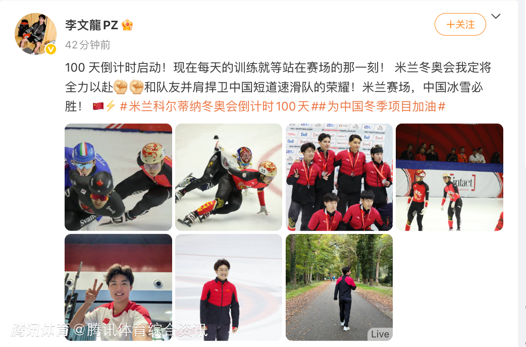 100 天倒计时启动!现在每天的训练就等站在赛场的那一刻! 米兰冬奥会我定将全力以赴。和队友并肩捍卫中国短道速滑队的荣耀!米兰赛场,中国冰雪必胜!