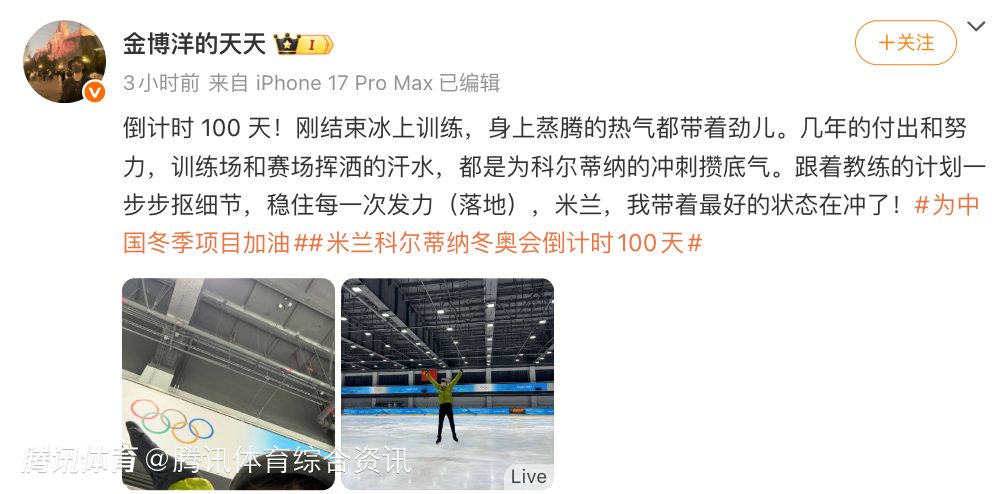 2025-10-29 18:00北京时间10月29日,今天距离米兰冬奥会开幕还有100天。中国多名选手更新社媒,发文加油蓄力。
