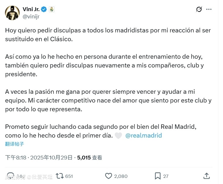 2025-10-29 21:50北京时间10月29日,皇马球星维尼修斯在社媒发文,就国家德比不满被换下的争议行为,向皇马球迷、队友、俱乐部和主席致歉。