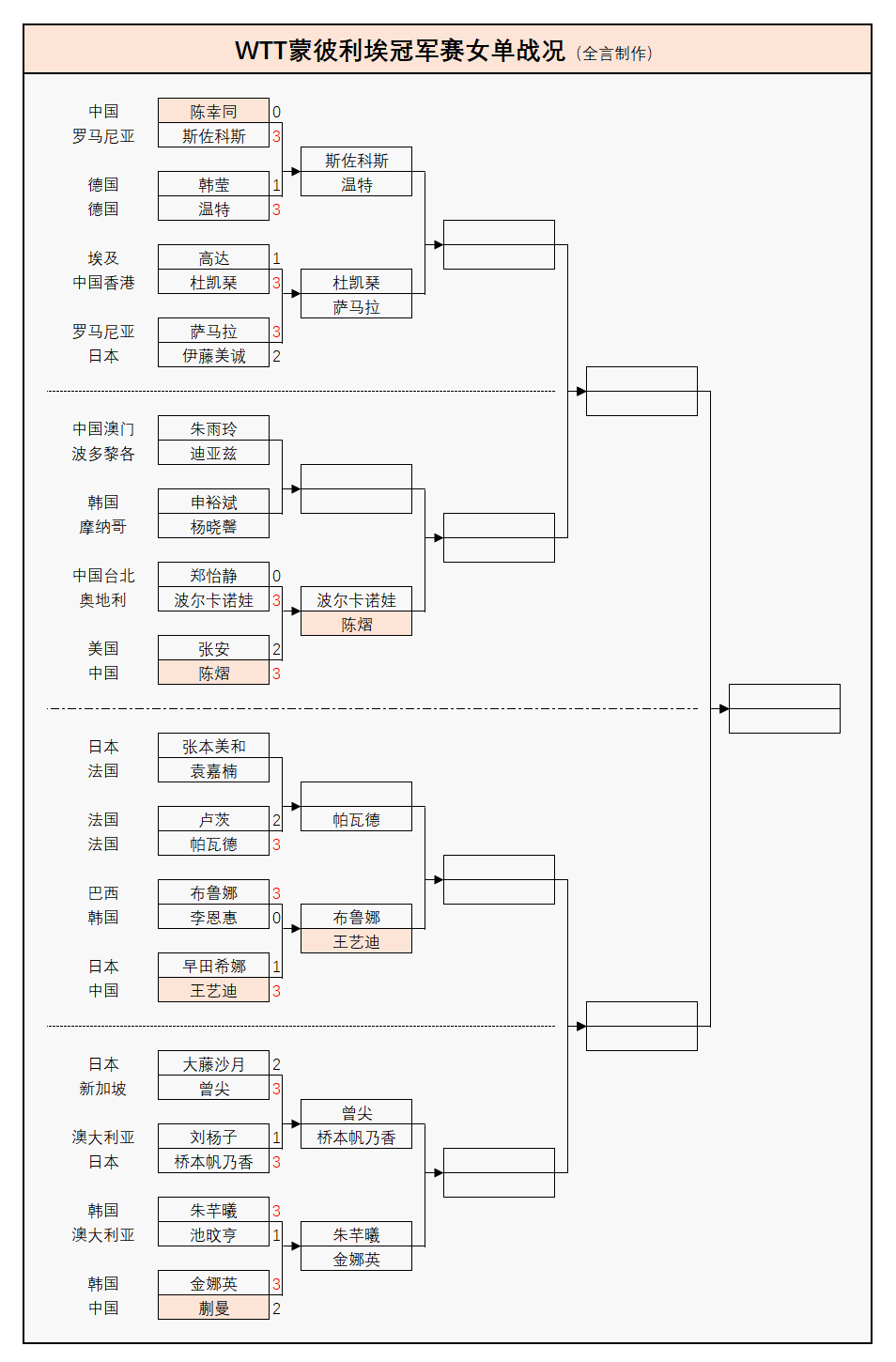 至于国乒男单3人目前已经全军覆没,女单也有2人被淘汰,全队仅剩王艺迪、陈熠2人继续前进,的确竞争激烈——以下为两项单打的最新进展: