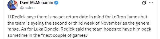 雷迪克:詹姆斯预计在11月第二或第三周复出 东契奇手指肿胀已缓解