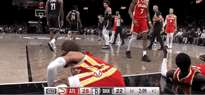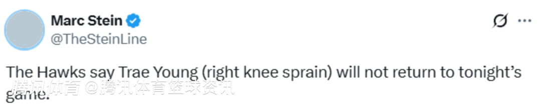 在一次篮网的发球回合中,篮网球员克洛尼撞倒了老鹰球员古耶,后者在倒地的时候,正好压到了特雷-杨的右膝,杨直接倒地,捂着自己的右膝,神情显得非常痛苦。随后名记Stein跟进报道,特雷-杨本场比赛因为右膝扭伤,不会回归。