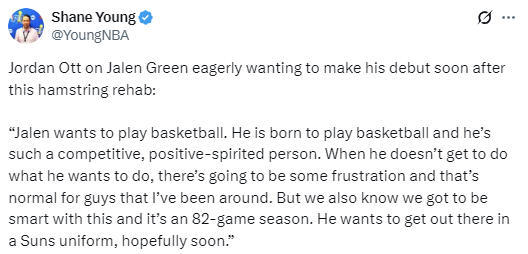 奥特表示:“杰伦-格林在恢复至可参赛状态的过程中,尚未出现任何伤病反复。他想打篮球,他就是为篮球而生的。他极具竞争意识,心态也非常积极。当他没法做自己想做的事(指打球)时,难免会有些沮丧。在我接触过的球员里,这种反应很正常。但我们也清楚,对待康复必须谨慎,毕竟这是一个有82场比赛的漫长赛季。他希望能穿上太阳队的球衣登场,但愿这一天能尽快到来。”