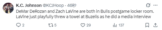 2025-10-30 11:50北京时间10月30日,NBA常规赛继续进行,公牛队126-113击败国王队。赛后,扎克-拉文和德罗赞两位公牛队的旧将前往公牛队的更衣室,与前队友们见面并进行了互动。