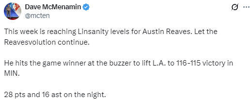 值得一提的是,湖人队记者Dave McMenamin也同样在赛后发推表示里夫斯这周的表现很像“林疯狂”。