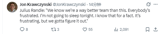 在谈到这场失利时,兰德尔表示:“我们很清楚,自己本是一支远比现在优秀的球队。所有人都很沮丧。我今晚肯定睡不着觉,这点我心里很清楚。情况确实令人懊恼,但我们必须找到解决办法。”