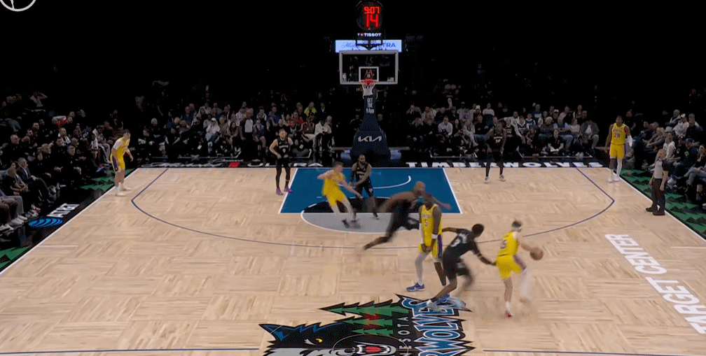 比如这个回合,原本拉拉维亚想打一次挡拆,但艾顿没有上提掩护,拉拉维亚只能单兵强突,他用欧洲步完成终结。