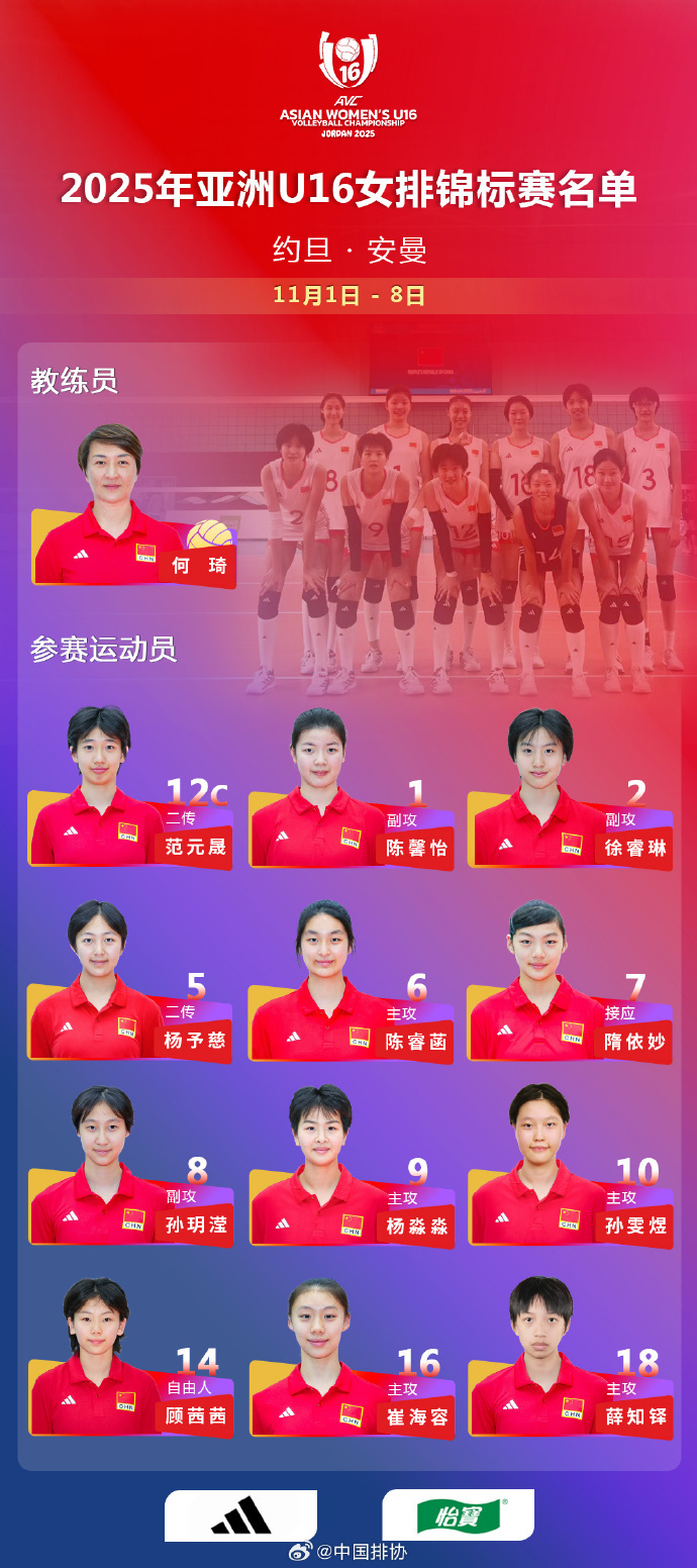 2025-10-30 16:40北京时间10月30日消息,中国排协于今日公布了中国队征战2025年U16女排亚锦赛的12人名单。中国U16女排将由前国手、“白银一代”的主力二传手何琦担任主教练。此次是何琦在转型成为教练员后第二次独立率领国字号球队参赛。在刚刚结束的2025年亚洲青年运动会女排比赛(U19年龄段)中,她带领这支U16年龄组的队伍出战,以小打大获得第5名。