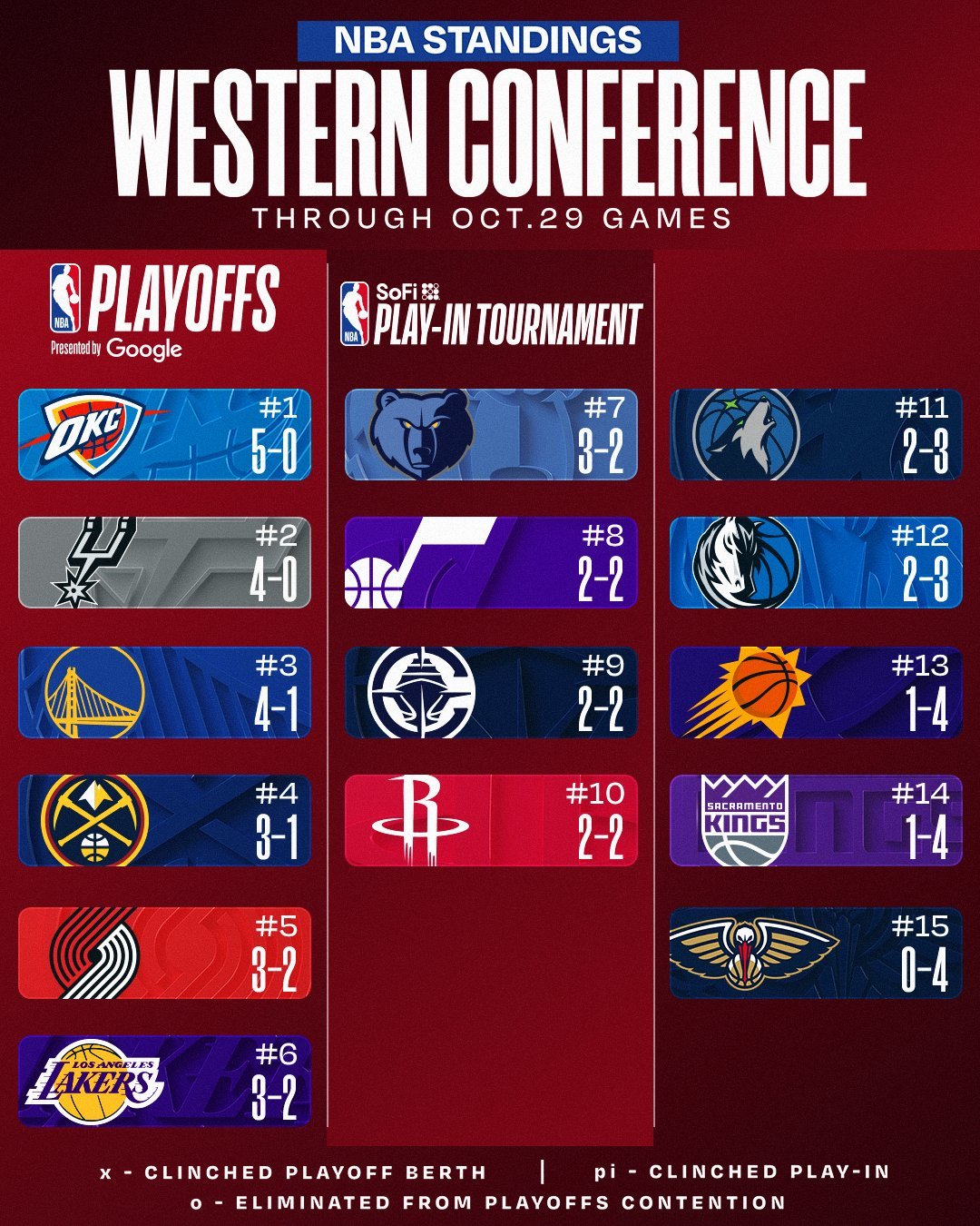 联盟目前尚未赢球的球队包括鹈鹕0胜4负、步行者0胜4负、篮网0胜5负。