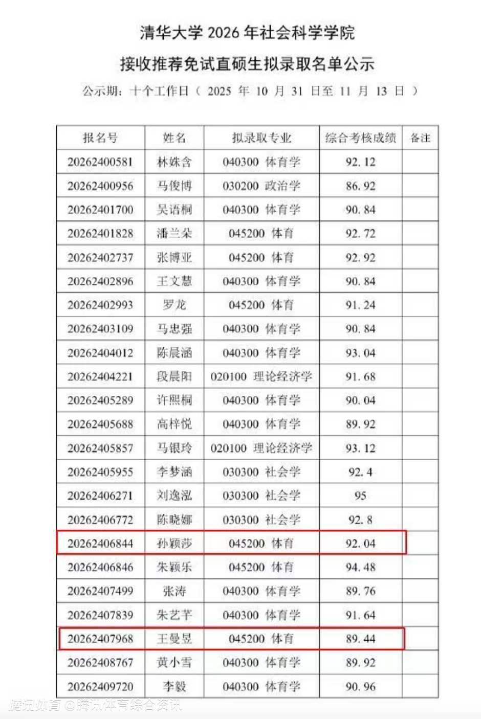 2025-10-30 18:30北京时间10月30日,清华大学社会科学学院公示2026年推荐免试直硕生拟录取名单,孙颖莎以92.04分、王曼昱以89.44分入选,二人就读专业均为体育专业。