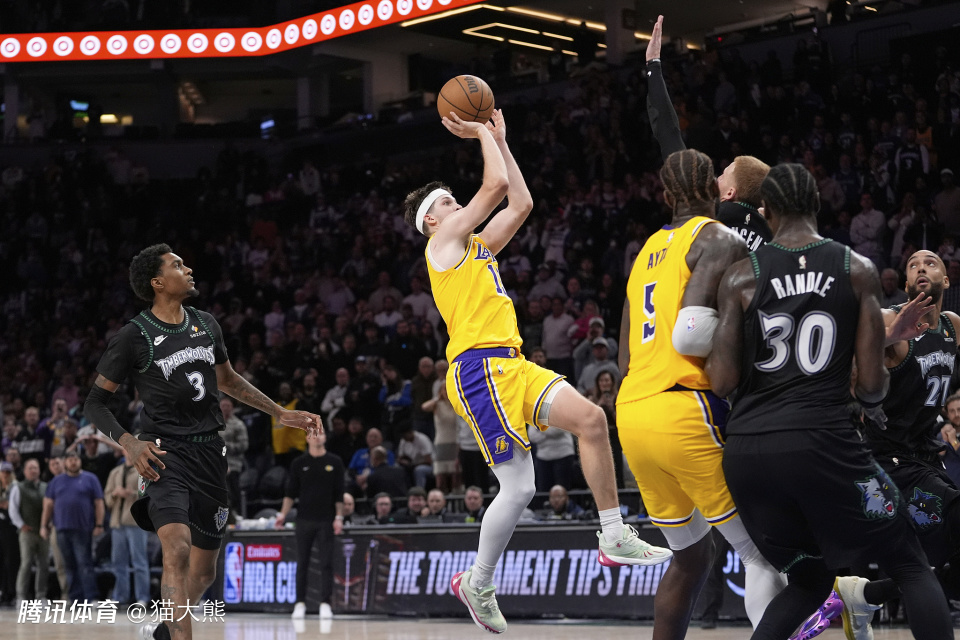 湖人116-115险胜森林狼,里夫斯完成抛投绝杀,他本场出战40分钟,24投9中,7罚7中,得到28分16助攻2抢断,成为自“魔术师”约翰逊和詹姆斯之后,队史第三位打出这组数据的球员。