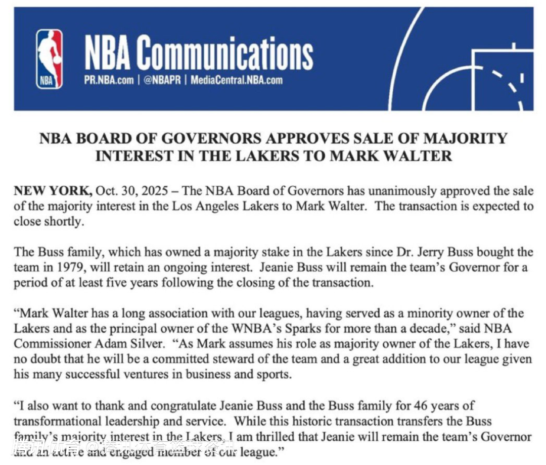 2025-10-31 00:40北京时间10月31日,NBA官方宣布,联盟理事会一致同意,批准马克-沃尔特收购湖人,交易预计在近期完成。据悉巴斯家族将继续保留部分股权,珍妮-巴斯在交易完成的至少5年内,继续担任湖人董事会代表。