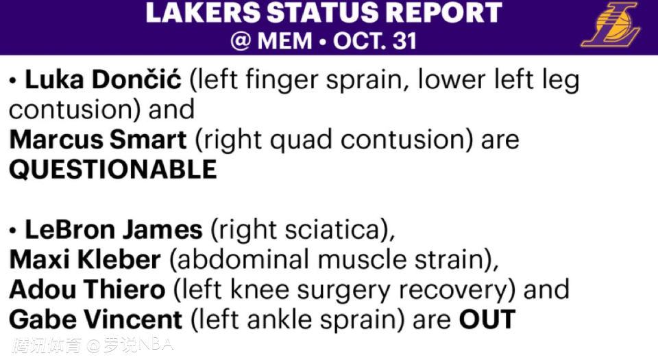 2025-10-31 06:30北京时间10月31日,湖人官方更新明日对阵灰熊的伤病报告,东契奇(左手指扭伤、左小腿挫伤)、斯马特(右侧股四头肌挫伤)的状态已经升级为出战成疑(50%可能出战)。詹姆斯(右侧坐骨神经痛)、克勒贝尔(腹部肌肉拉伤)、阿杜-蒂耶罗(左膝手术恢复)和文森特(左脚踝扭伤)继续缺阵。海斯已经不在伤病报告中,预计也可以出战灰熊。
