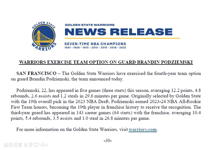 2025-10-31 06:30北京时间10月31日,勇士官方宣布,已执行后卫波杰姆斯基2026-27赛季的新秀合同球队选项。