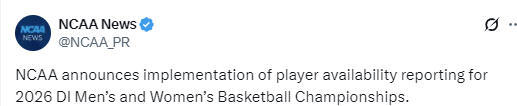 2025-10-31 07:10北京时间10月31日,NCAA官方宣布,协会总部将为2026年NCAA一级联盟男篮和女篮锦标赛推行“球员出战状态报告”制度。