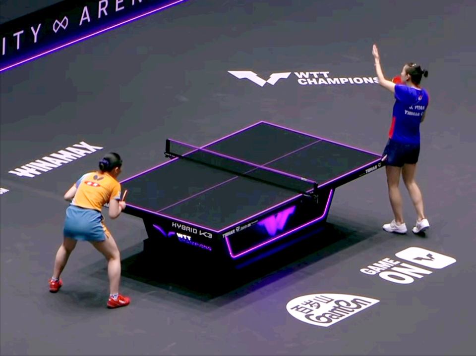 比赛开始后,张本美和迅速进入状态,尤其非常适应袁嘉楠的超高抛发球,同时自己也加强回球的旋转压制对方的速度,很快便取得3分左右的领先优势,后半段逐渐拉开分差并以10-5领先拿到局点,再得1分后以11-5比较轻松地先赢一局。