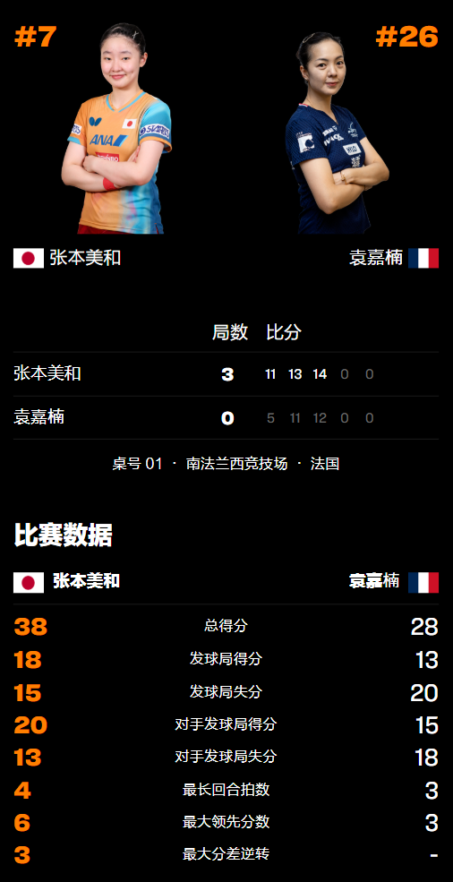 桥本帆乃香3-1刘杨子(澳大利亚)、张本美和3-0袁嘉楠(法国);