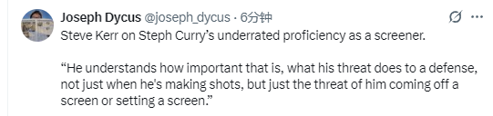 科尔在谈到库里时表示:“他很清楚掩护的重要性,也明白自己的威慑力会给防守端带来怎样的影响,这种影响不仅体现在他投篮得分时,更体现在他借掩护跑位或为队友做掩护的威胁本身。要知道,(掩护)一直是我们战术体系里非常重要的一部分,而库里不仅非常乐意做这件事,在身体对抗中还能稳稳占据位置,而且他的掩护能力每年都在提升。”