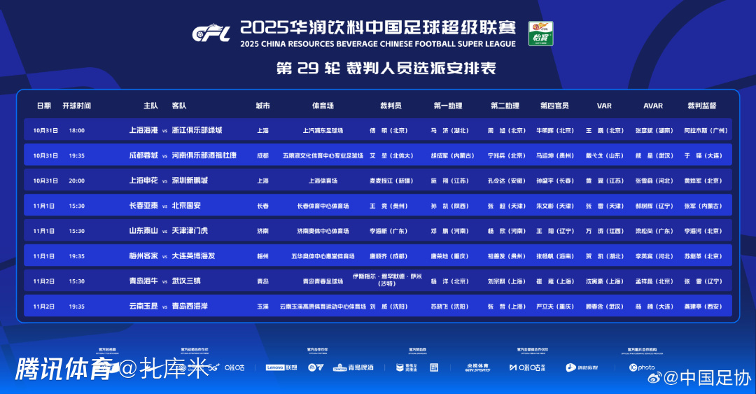 2025-10-31 10:10北京时间10月31日,中超第29轮的对决即将打响,赛前,官方公布了本轮的执法裁判名单。傅明执法海港和浙江的焦点对决,艾堃执法蓉城和河南队的比赛,麦麦提江则主哨申花和深圳的比赛。此外,青岛海牛和武汉三镇的比赛,由沙特名哨伊斯梅尔执法。
