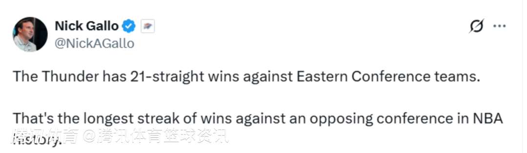 据统计,雷霆队已取得对阵东部联盟球队的21连胜。这是NBA历史上对阵另一个联盟球队的最长连胜纪录。