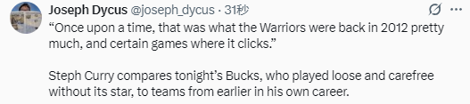 库里将这支在核心球星缺阵的情况下,仍打得放松自在、毫无包袱的雄鹿队比作2012年的勇士队。他说道:“回想从前,差不多是2012年那段时间吧,我们有些比赛打得顺风顺水,也有些比赛打得磕磕绊绊。而今晚,我们又看到了这样一场比赛,球队身上那种无拘无束的活力又回来了,打出了相当不错的表现,还突然展现出了高水平的竞技状态。”