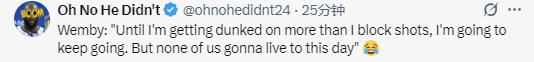 在谈到自己被阿德巴约隔扣的那球时,文班亚马说道:“除非我被隔扣的次数多于我盖帽的次数,否则我就会一直坚持这么打,但没人会等到那一天的到来。”