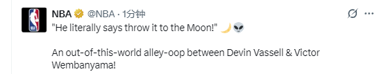 瓦塞尔表示:“我们之前在训练馆一起练球时,他跟我说过,‘把球扔到月亮上’,而那次传球真的就像是‘把球扔到了月亮上’,他也确实接住了球完成扣篮,事情就是这样。”