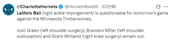 2025-11-01 05:50北京时间11月1日,黄蜂队官方公布球队对阵森林狼队的伤病报告,拉梅洛-鲍尔再次进入伤病名单报告,本场比赛出战成疑。