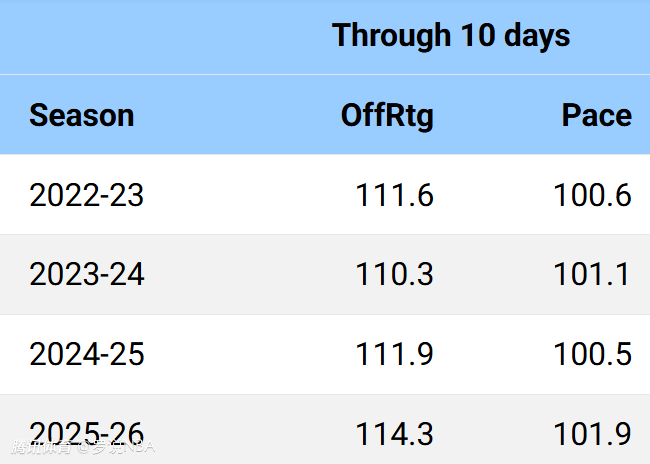进攻效率方面,联盟每百回合得分为114.3分,已接近历史最高纪录——两个赛季前的114.5分(整个赛季)。而当时同期(前10天)联盟每百回合得分仅为110.3分,这意味着联盟大概率将在过去8个赛季中第6次刷新进攻效率纪录。