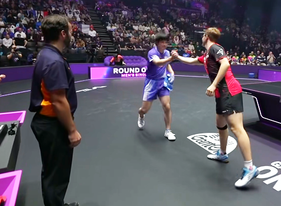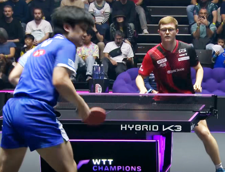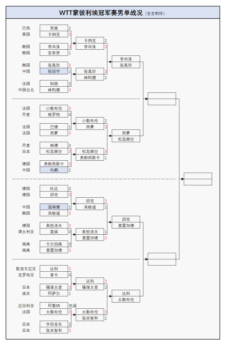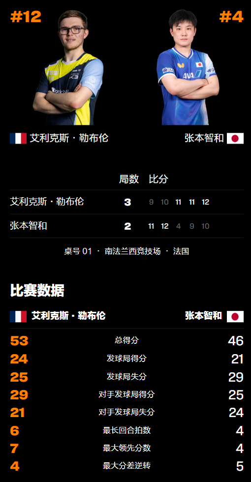 第三局大勒布伦背水一战又开局落后于人,追回1球后被张本智和打退台丢分但很快再次战平比分,中间段逐渐扩大优势最终没有重蹈前两局的覆辙、以11-4扳回一城,比赛悬念得以延续。