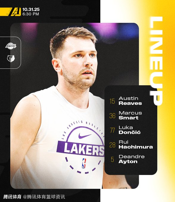 2025-11-01 09:20北京时间11月1日,NBA杯赛开战,湖人队对阵灰熊队。赛前,湖人队方面公布本场比赛首发阵容名单,东契奇和斯马特复出并出现在首发阵容中。