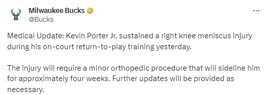 雄鹿队在官方公告中写道:“小凯文-波特昨日在球场上进行复出训练时,右膝半月板受伤。该伤势需接受一台小型骨科手术,术后他将休战约4周。后续将根据需要进一步发布相关更新信息。”